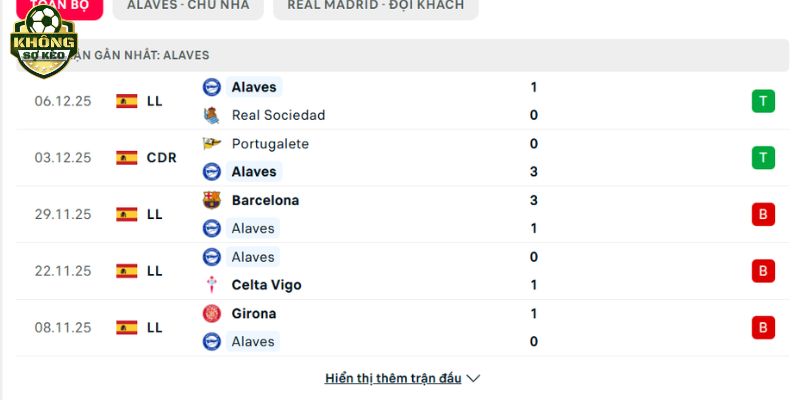 Alaves hiện đang có thành tích 5 chiến thắng, 3 trận hòa và 7 thất bại sau 15 trận đấu La Liga mùa này. Tổng cộng 18 điểm giúp họ đứng ở vị trí thứ 11 trên bảng xếp hạng. Tuy nhiên, họ sẽ có thử thách rất lớn khi tiếp đón Real Madrid đang sở hữu thành tích sân khách tốt nhất giải đấu. Hãy cùng Không Sợ Kèo nhận định trận Alaves vs Real Madrid.