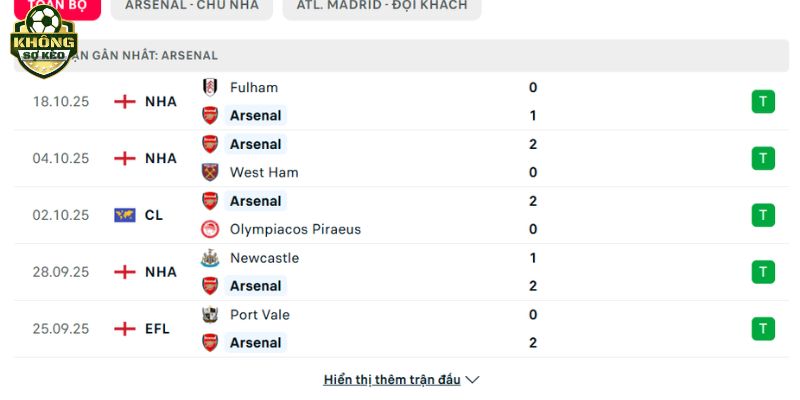 Thành tích đối đầu Arsenal vs Atletico Madrid