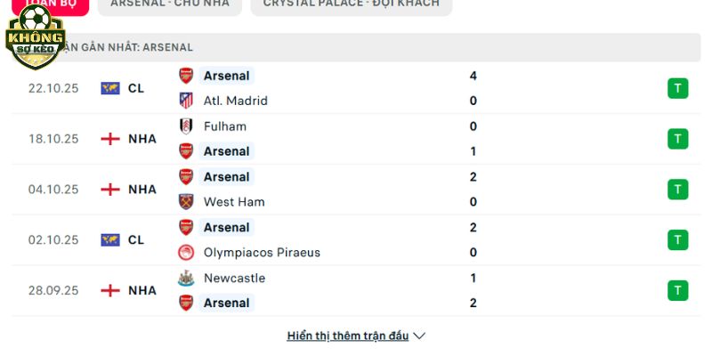 Thành tích đối đầu gần đây tại Premier League cho thấy Arsenal có sự áp đảo rõ rệt trước Crystal Palace. Arsenal thắng 5/6 lần chạm trán gần nhất tại Premier League, cho thấy Pháo Thủ thường xuyên tìm ra cách để đánh bại Đại Bàng.