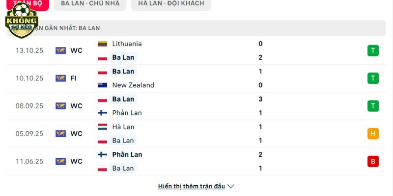 7 trận gần nhất: Ba Lan 0 thắng, Hà Lan 5 thắng, Hòa 2.
