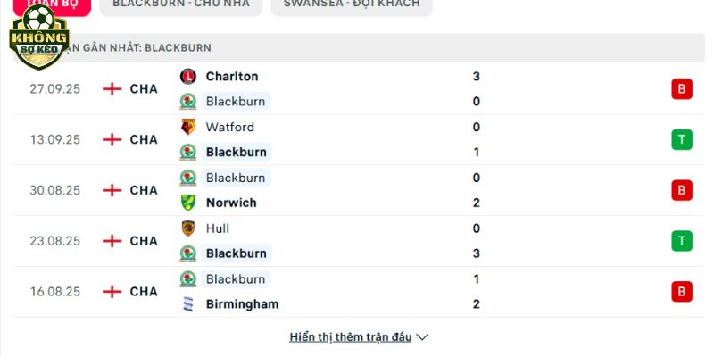Thành tích đối đầu Blackburn Rovers vs Swansea City