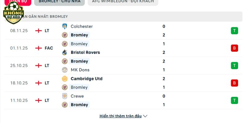 Điều đáng chú ý là Bromley lại đang có ưu thế trong các cuộc đối đầu gần nhất. Họ đã thắng 2 trận liên tiếp trước AFC Wimbledon, bao gồm chiến thắng 1-0 tại League Two vào tháng 3/2025 và 2-0 vào tháng 8/2024.