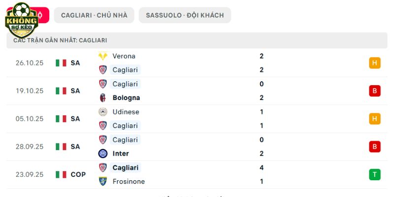 Phong độ Cagliari vs Sassuolo