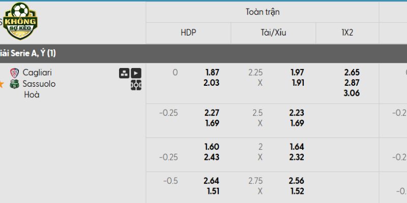 Tỷ lệ kèo Cagliari vs Sassuolo