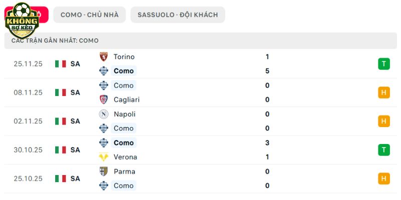 Điểm mạnh tuyệt đối của Como nằm ở pháo đài Singaglia. Bất bại trên sân nhà (3 thắng, 3 hòa) cho thấy sự khó chịu và khả năng kiểm soát thế trận của đội bóng này khi được chơi trên mặt cỏ quen thuộc. Thắng lợi 3-0 trước chính Sassuolo tại Coppa Italia cũng là lợi thế tâm lý lớn. Como sẽ bước vào trận đấu với sự tự tin cao nhất, đặt mục tiêu duy trì vị thế trong top 6 và san bằng kỷ lục lịch sử 11 trận bất bại.