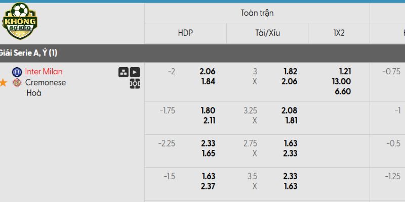 Tỷ lệ kèo Inter Milan vs Cremonese