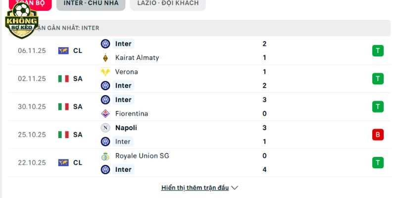 Thành tích đối đầu gần đây giữa Inter Milan vs Lazio cho thấy sự cân bằng đáng ngạc nhiên, đặc biệt là khi Lazio làm khách tại Giuseppe Meazza. Họ đã giành được điểm trong hai lần gặp gỡ gần nhất tại Milan, trong đó đáng chú ý nhất là trận hòa kịch tính vào tháng 5.