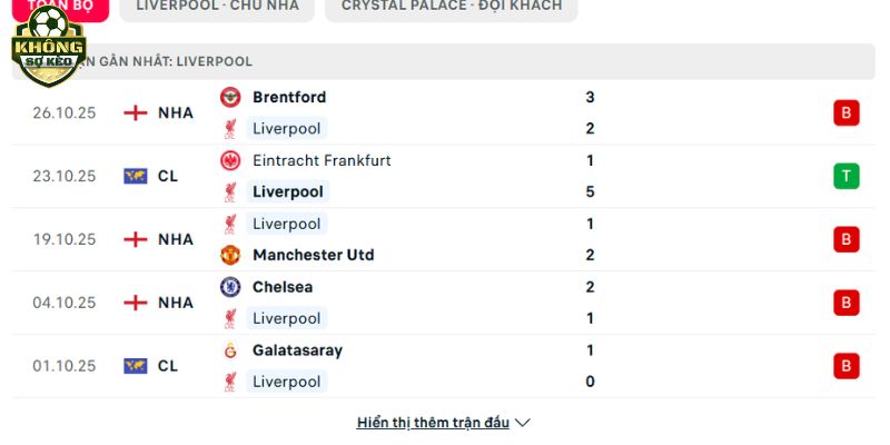 Thành tích đối đầu Liverpool vs Crystal Palace
