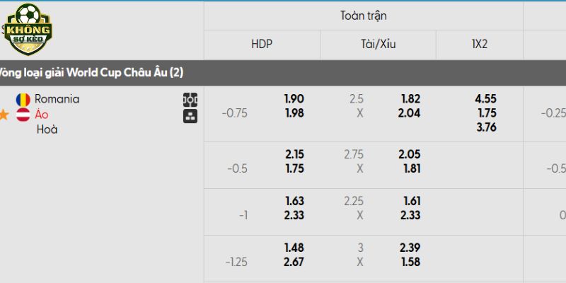 Tỷ lệ kèo Romania vs Áo